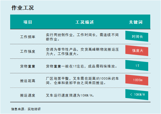 第三,廠區(qū)地面平整,叉車需在距離約1000米的車間、倉(cāng)庫(kù)和裝卸平臺(tái)之間來(lái)回搬運(yùn);