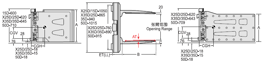 | Capacity 承載能力(kg) | Catalog Order NO 型號(hào) | Mounting Class 安裝等級(jí) | Opening Range張臂范圍(mm) | Rad Height夾板高度A(mm) | Arm Length臂長B(mm) | Arm Thickness臂厚C(見注5)(mm) | Arm Toe in內(nèi)扣量AT(見注6)(mm) | Vertcial Center Of Gravity垂直重心CGV(mm) | Weight 自重(kg) | Effective 失載距ET(mm) | Horizontal Center of Gravity 水平重心CGH(mm) |