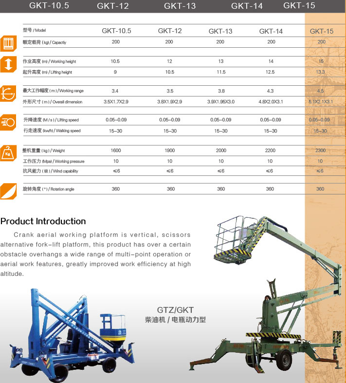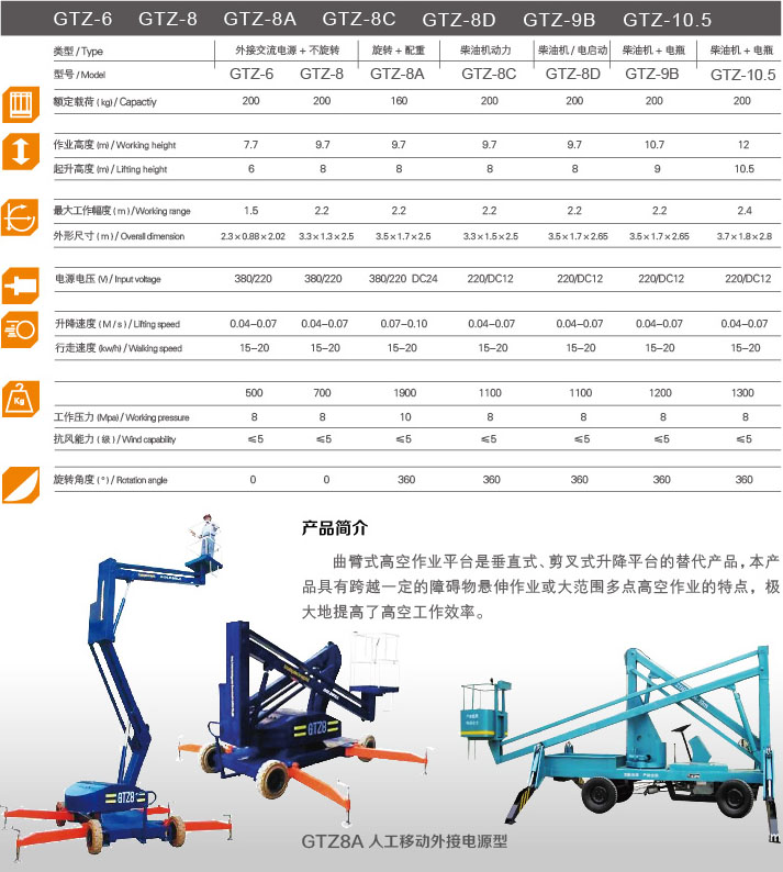 曲臂式高空作業(yè)平臺(tái)是垂直式、剪叉式升降平臺(tái)的替代品,本產(chǎn)品具有跨越一定的障礙物懸伸作業(yè)或大范圍多點(diǎn)高空作業(yè)的特點(diǎn),極大地提高了高空工作效率。